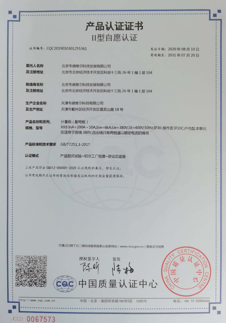 XXB型低壓開關(guān)柜產(chǎn)品認(rèn)證證書