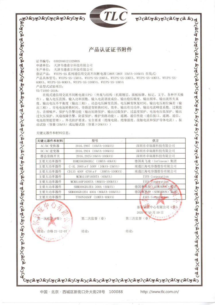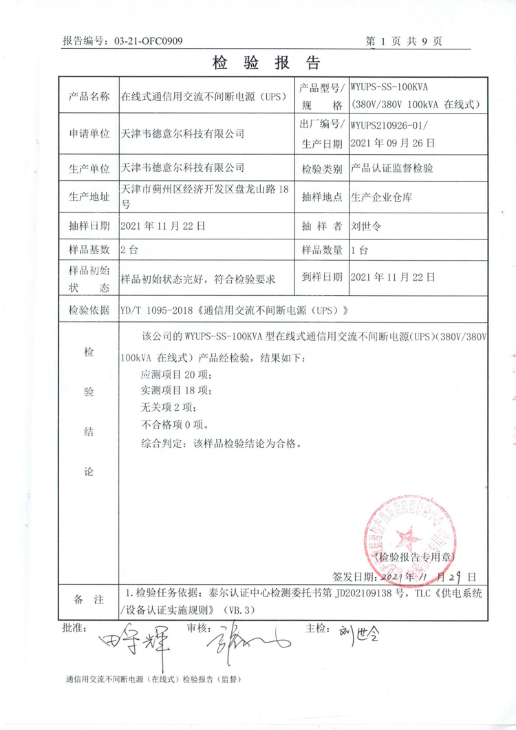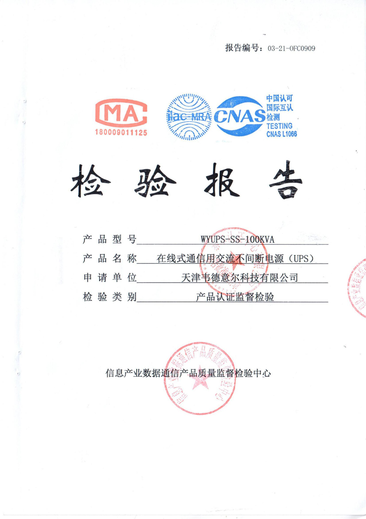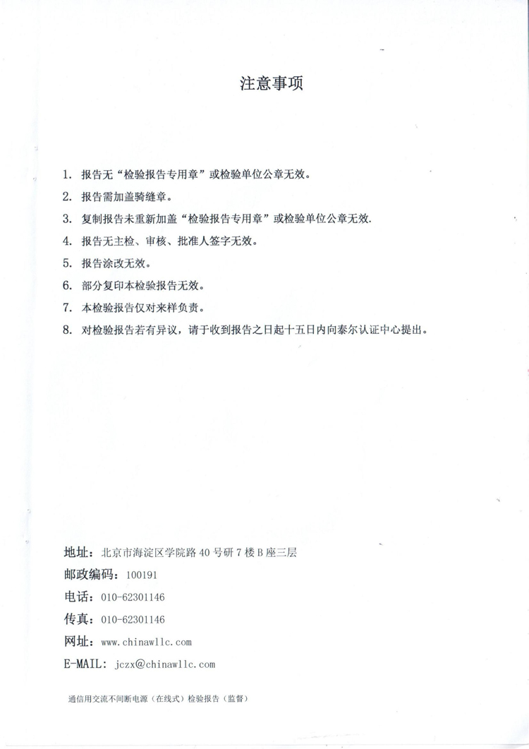 在線式通信用交流不間斷電源(UPS)100kVA泰爾認(rèn)證證書及檢驗報告
