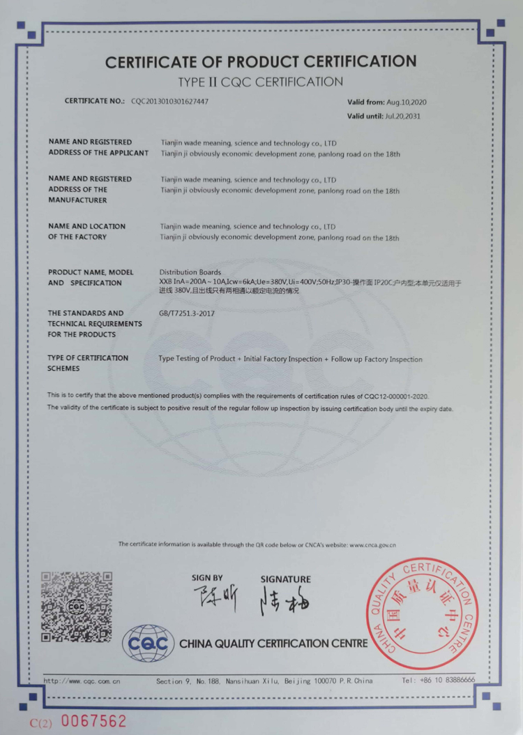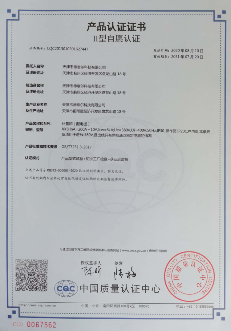 計量箱(配電板)產(chǎn)品認(rèn)證證書
