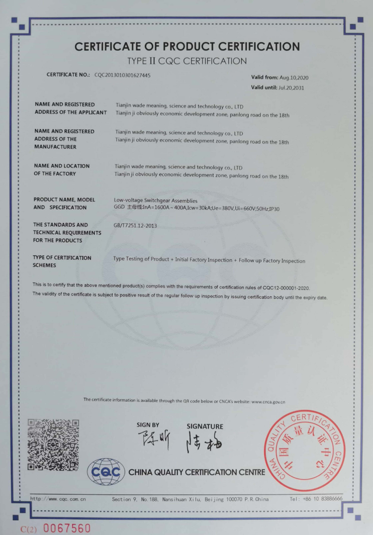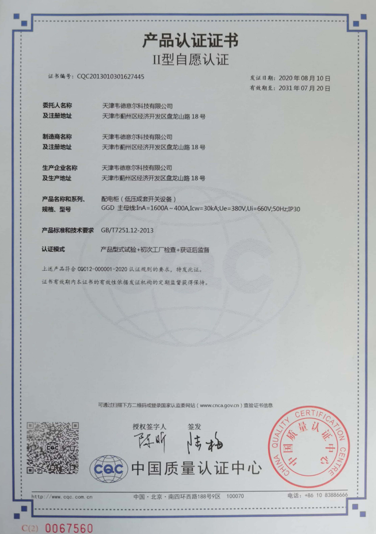 配電柜(低壓成套開關(guān)設(shè)備)產(chǎn)品認證證書