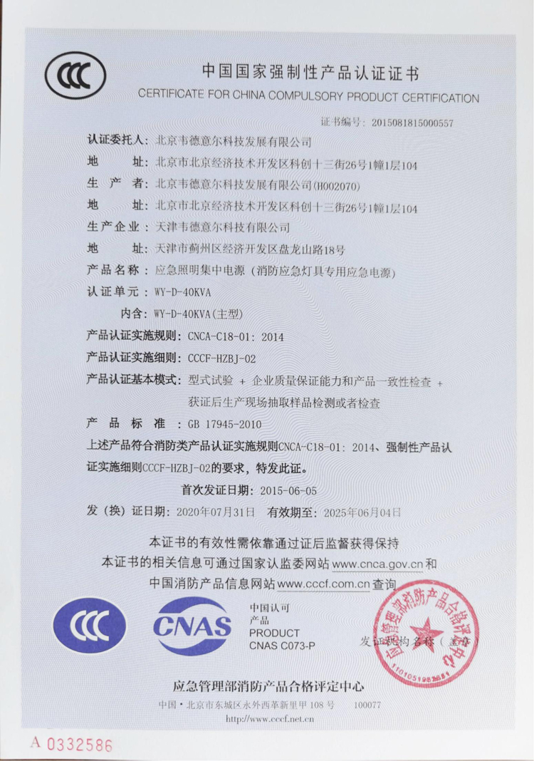 應(yīng)急照明集中電源WY-D-40KVA產(chǎn)品認證證書