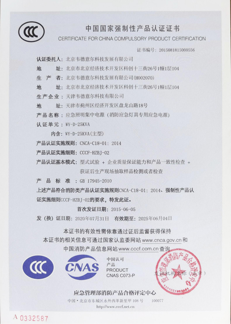 應(yīng)急照明集中電源WY-D-25KVA產(chǎn)品認(rèn)證證書