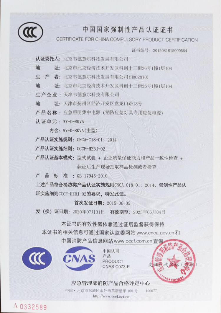 應(yīng)急照明集中電源WY-D-8KVA產(chǎn)品認(rèn)證證書(shū)
