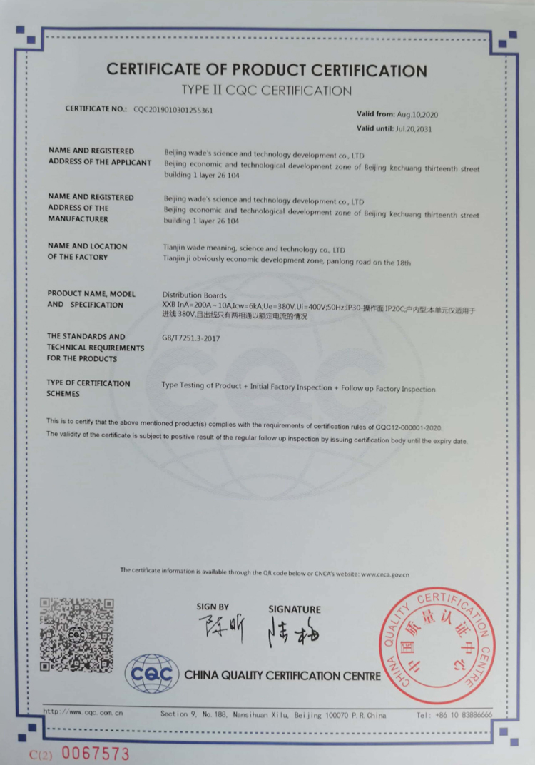 XXB型低壓開關(guān)柜產(chǎn)品認(rèn)證證書