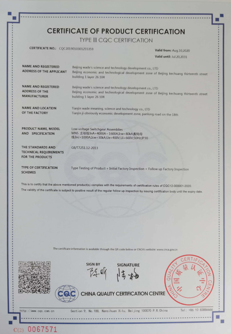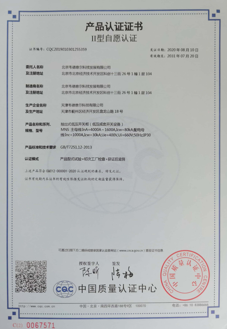 MNS型低壓開關(guān)柜產(chǎn)品認證證書